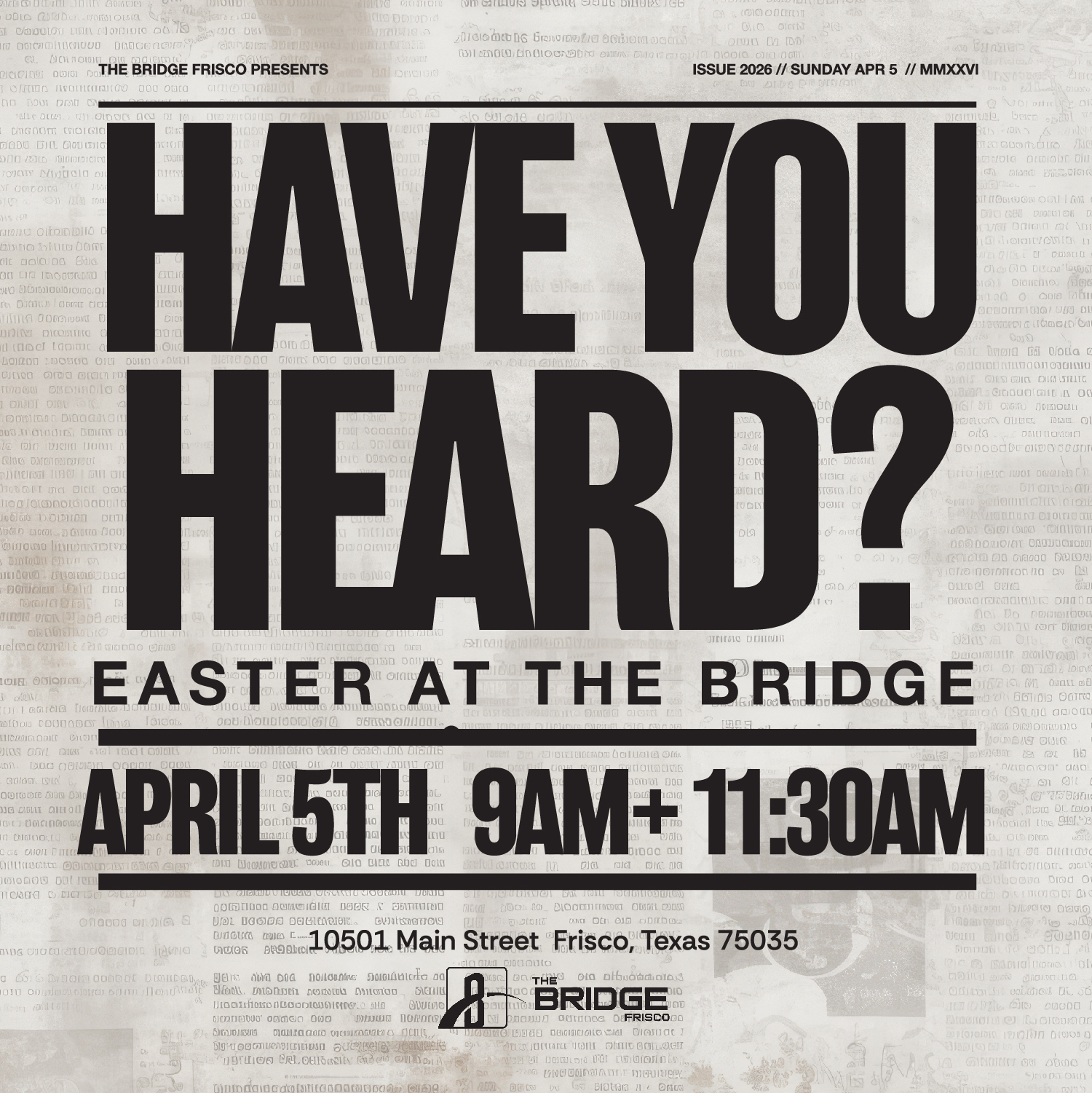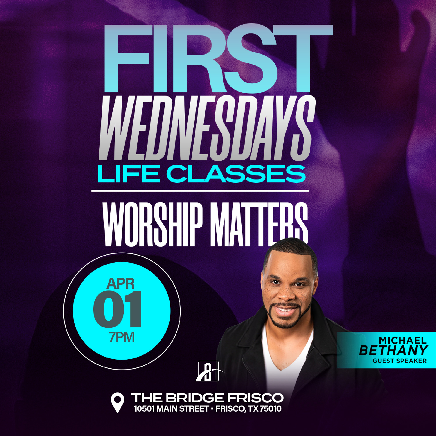 Loading view. Views Navigation Event Views Navigation List List Month Day Today 2026-04-01 onwards April 1 onwards Select date. April 2026 Wed 1 April 1 @ 7:00 pm - 9:00 pm First Wednesdays Life Class : Money Matters The Bridge Frisco 10501 Main St., Frisco Sun 5 April 5 FIRST FRUITS SUNDAY The Bridge Frisco 10501 Main St., Frisco Sun 5 April 5 @ 9:00 am - 1:00 pm Easter at The Bridge The Bridge Frisco 10501 Main St., Frisco Mon 13 April 13 @ 7:00 pm - 9:00 pm Thrive Women’s Ministry The Bridge Frisco 10501 Main St., Frisco Previous Events Today Next Events Subscribe to calendar Google Calendar iCalendar Outlook 365 Outlook Live Export .ics file Export Outlook .ics file